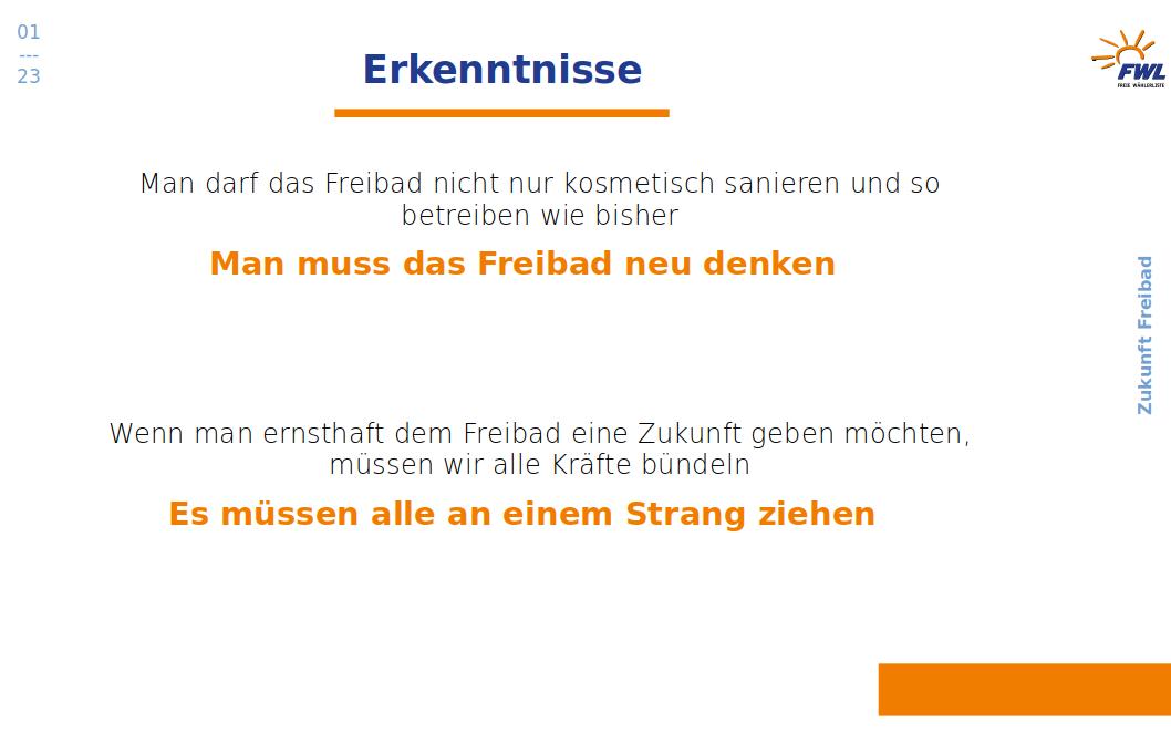 Insgesamt waren Zuhörerinnen und Zuhörer beeindruckt von der Expertise des Fraktionsvorsitzenden der FWL und zollten Dr. Post in der Gesprächsrunde nach dem Vortrag, an der er auch für Fragen Rede und Antwort stand, begeistert Beifall und großen Respekt. „Zwar sei der Aufwand für einen solchen Fachvortrag mit TED-Umfrage gewaltig, doch die durchweg positive Resonanz bestätigt und motiviert uns Freie Wähler, für unser Freibad eine solche Veranstaltung durchzuführen und am Thema dran zu bleiben.“ resümierte der Referent und Gemeindevertreter.