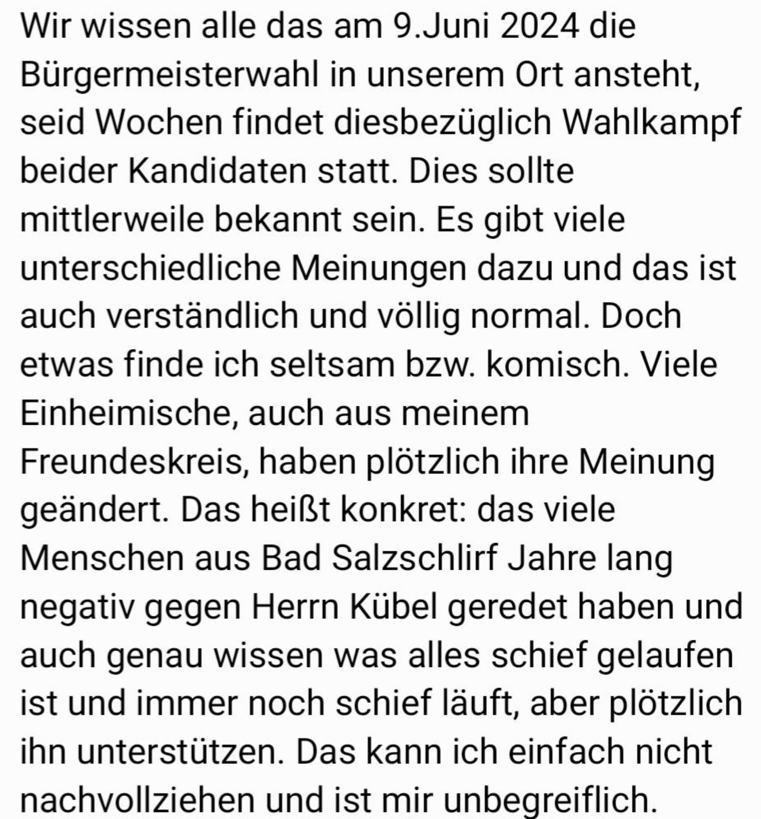 Das, was ich im laufenden Bürgermeisterwahlkampf feststellte, hat m.E. wenig mit Chancengleichheit und Fairness gegenüber Herrn Klug zu tun und das ist der Grund meiner Wortmeldung. Ich bemängele z.B., dass der Bad Salzschlirfer CDU-Vorsitzende gleichzeitig auch Leiter des Hauptamts der Gemeinde, ja Wahlleiter ist, zumal er Herrn Kübel zuvor mit zum Bürgermeisterkandidaten gekürt hat. Das ist zulässig, hat einen gewissen Beigeschmack. Arbeit in der Gemeindeverwaltung und örtliche Parteipolitik sollten möglichst personell getrennt sein.