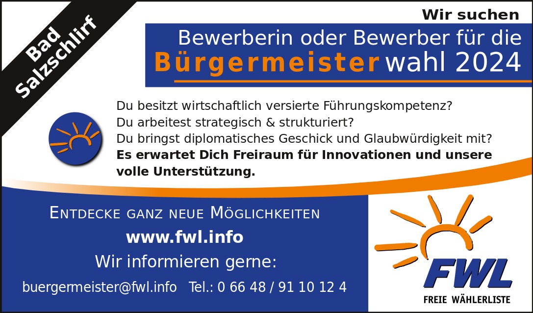Die FWL bietet den Menschen viele Ideen für Bad Salzschlirf, Ziele, wie es mit dem Ort in Zukunft weiter gehen soll. Obwohl politisch stärkste Kraft, verhallen diese Chancen durch eine erzwungene Oppositionsrolle. Eine zielführende Weiterentwicklung der Gemeinde ist nur möglich, wenn an der Spitze der Gemeindepolitik eine motivierte, kompetente und verbindende Persönlichkeit steht.