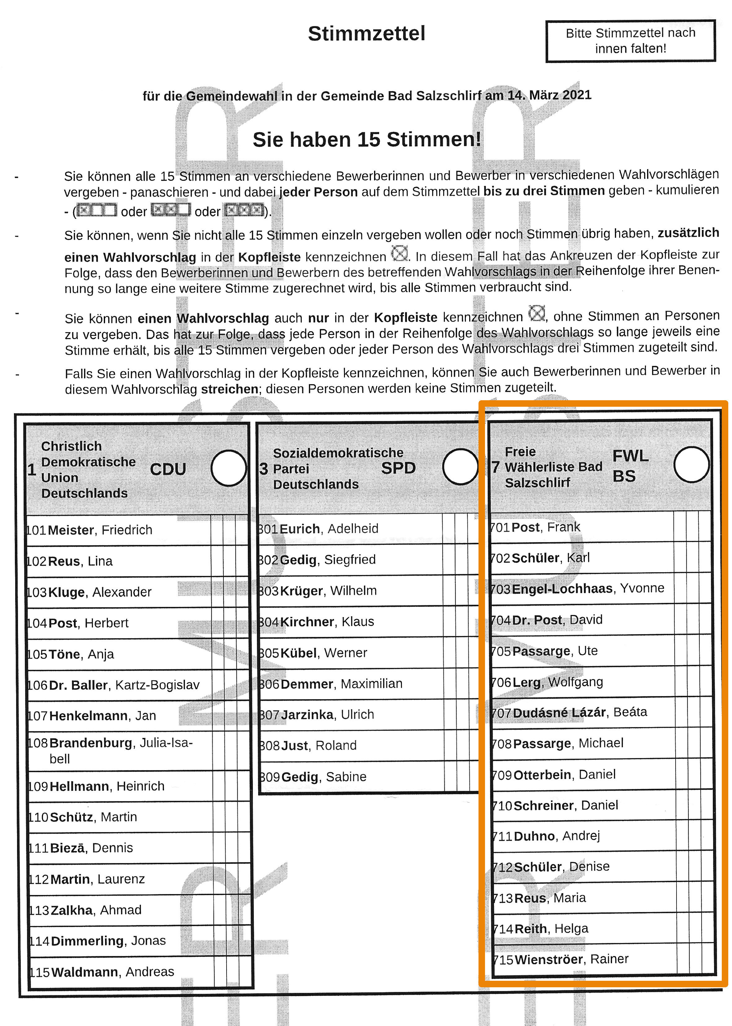 Sie könnnen 15 Stimmen vergeben. Gehen Sie auf Nummer sicher: immer zuerst Liste 7 - FWL ankreuzen - so geht keine Stimme für die FWL verloren.