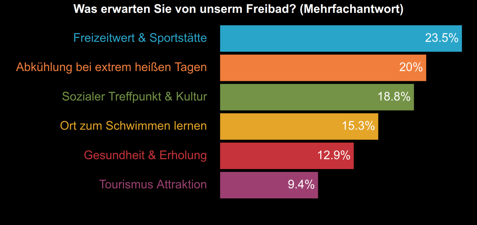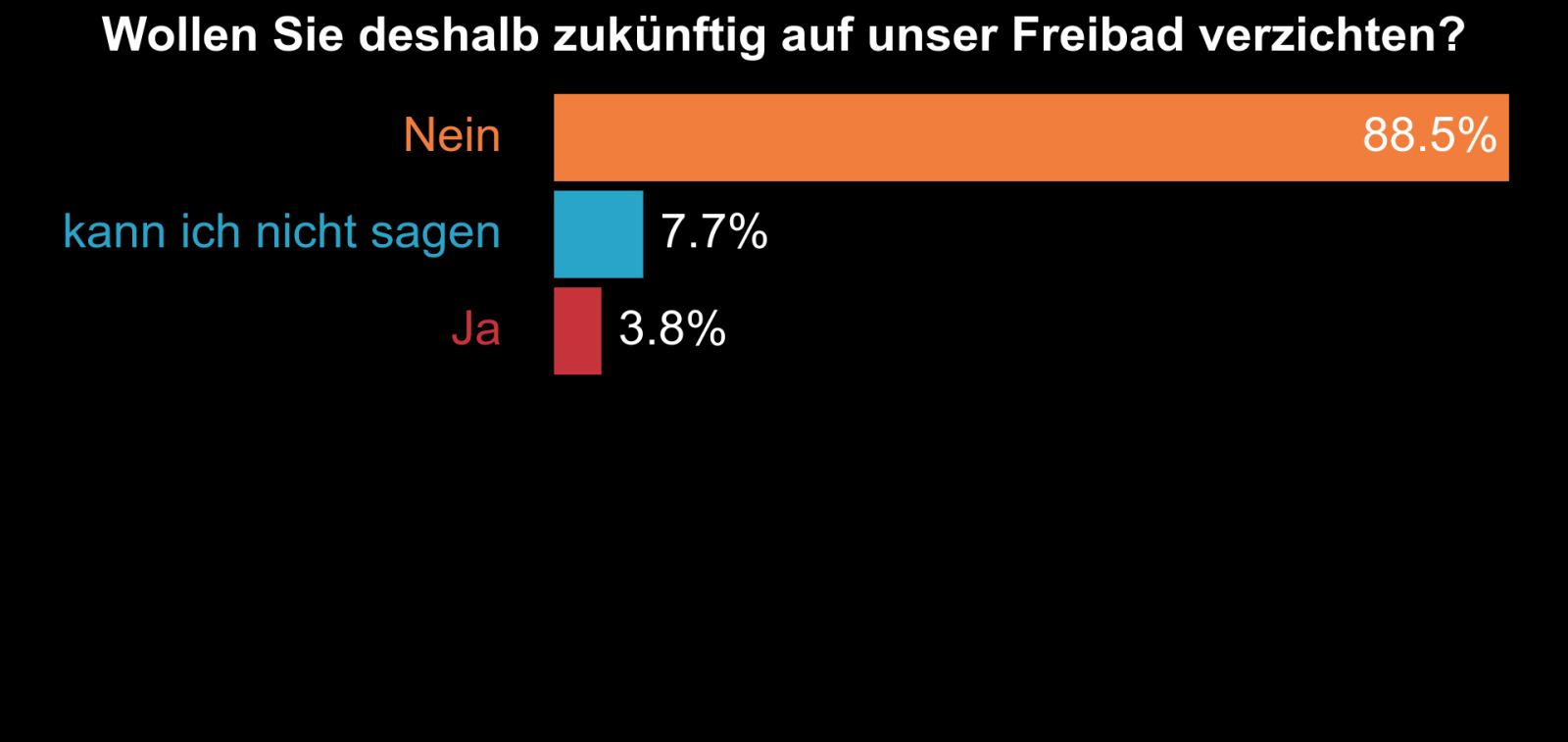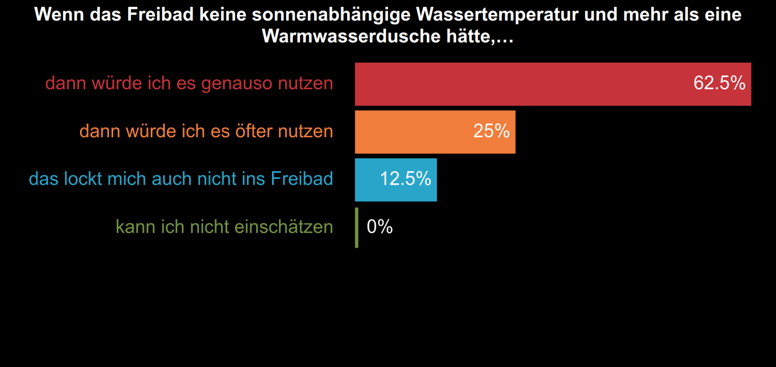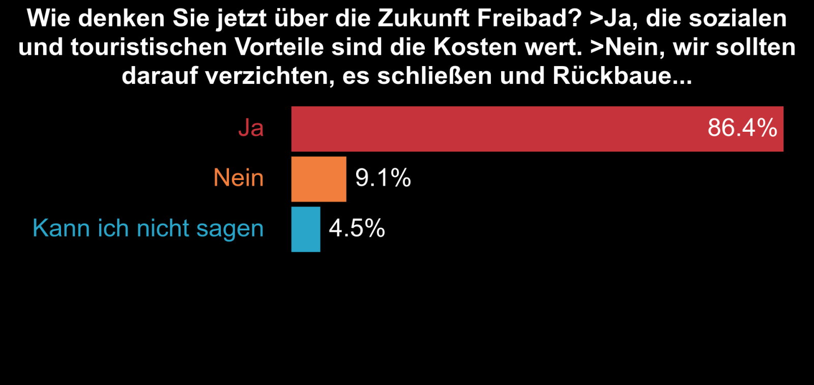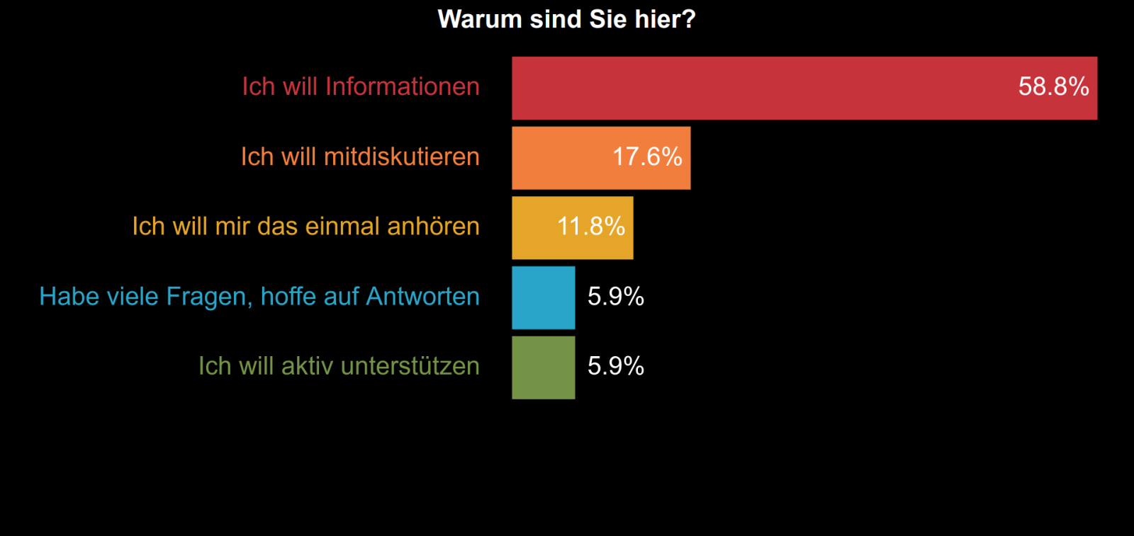 Zwischenzeitliche TED-Umfragen weckten sehr schnell das Interesse der Anwesenden und ermöglichten schnell eine Beteiligung und Stimmungsbilder konnten am Anfang und am Ende verglichen werden. Hier zeigte sich beispielsweise, dass seit Schließung des Freibades der private Pool eine hohe Nutzung erfahren hat, er aber keine Alternative für ein Freibad darstelle.