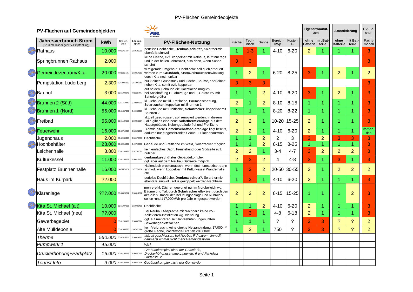 Ziel wäre nicht primär eine hohe Stromerzeugung, sondern eine große Strom- und damit CO2-Einsparung beim Objekt (Eigennutzen) und eine zukünftige finanzielle Einsparung (Amortisierung). Dazu eignen sich Objekt mit: