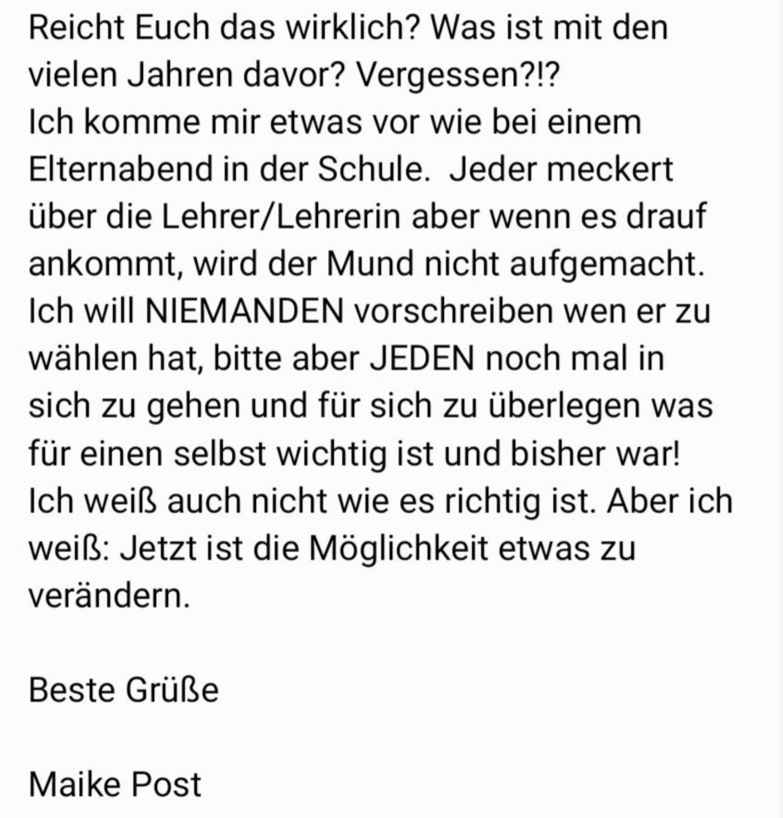 Für die vielen Rückmeldungen des Wahlkampfes stehen exemplarisch zwei bemerkenswerte Briefe, die zum Nachdenken anregen sollten. Einmal den Blick des außenstehenden ehemaligen Bürgermeisters von Großenlüder Werner Dietrich und den innenstehenden Blick einer aktiven Familienmutter Maike Post.